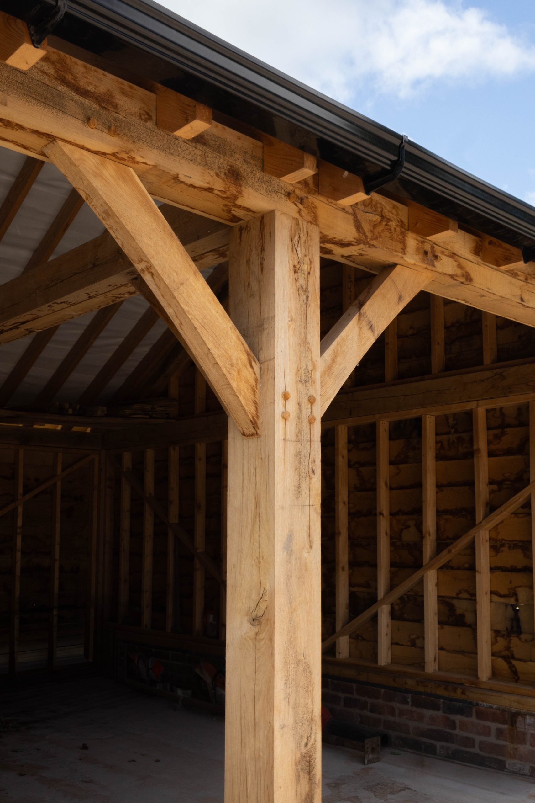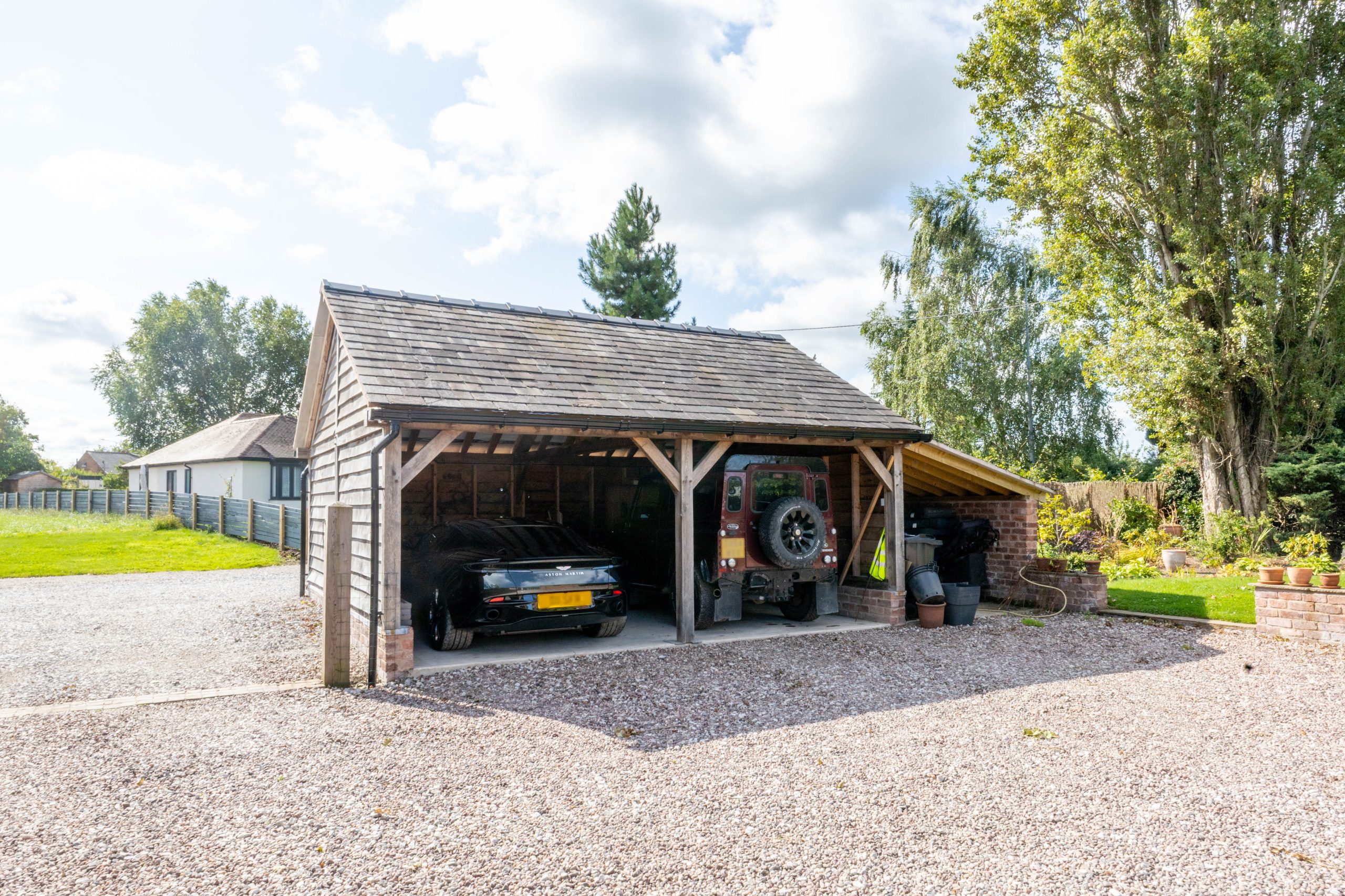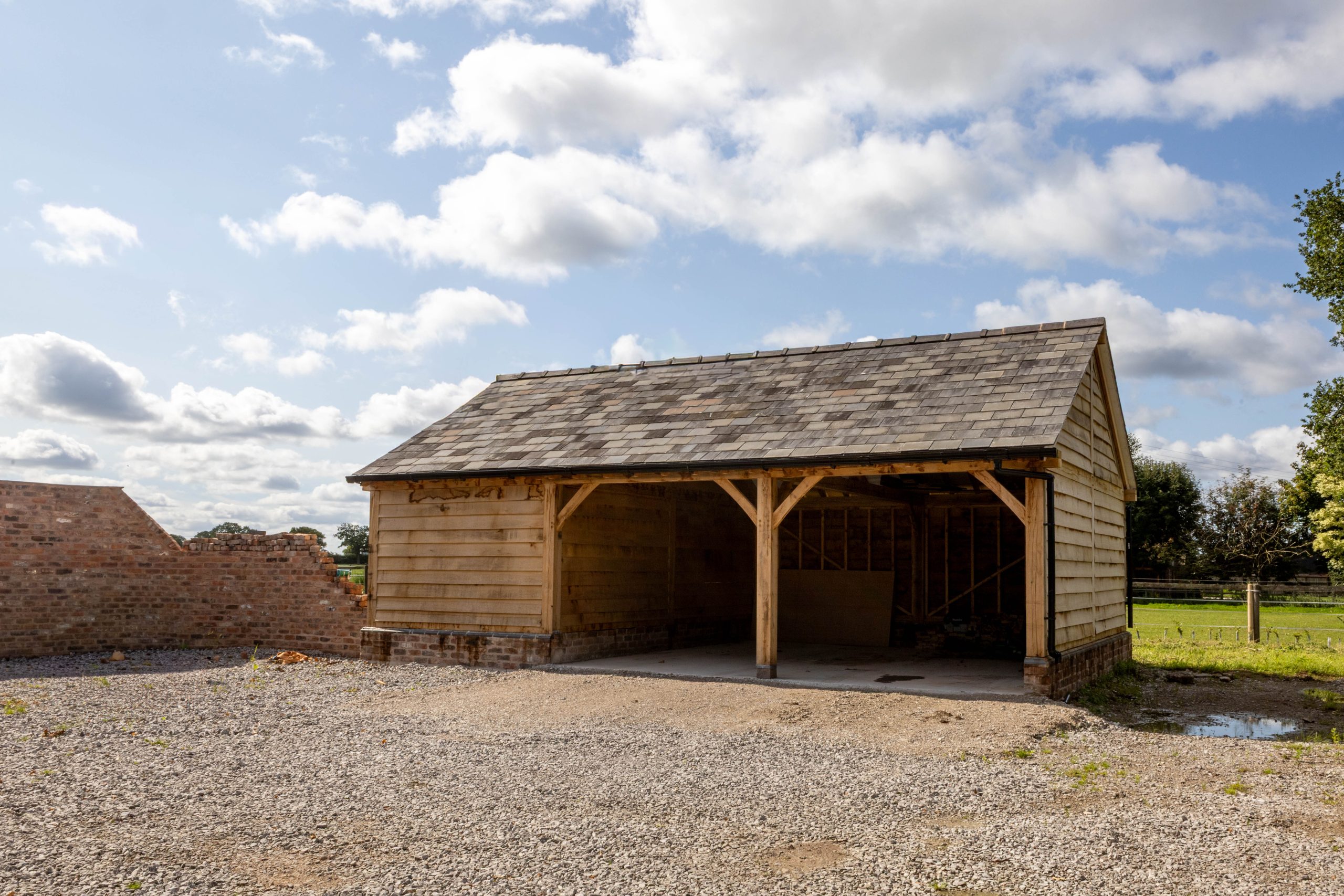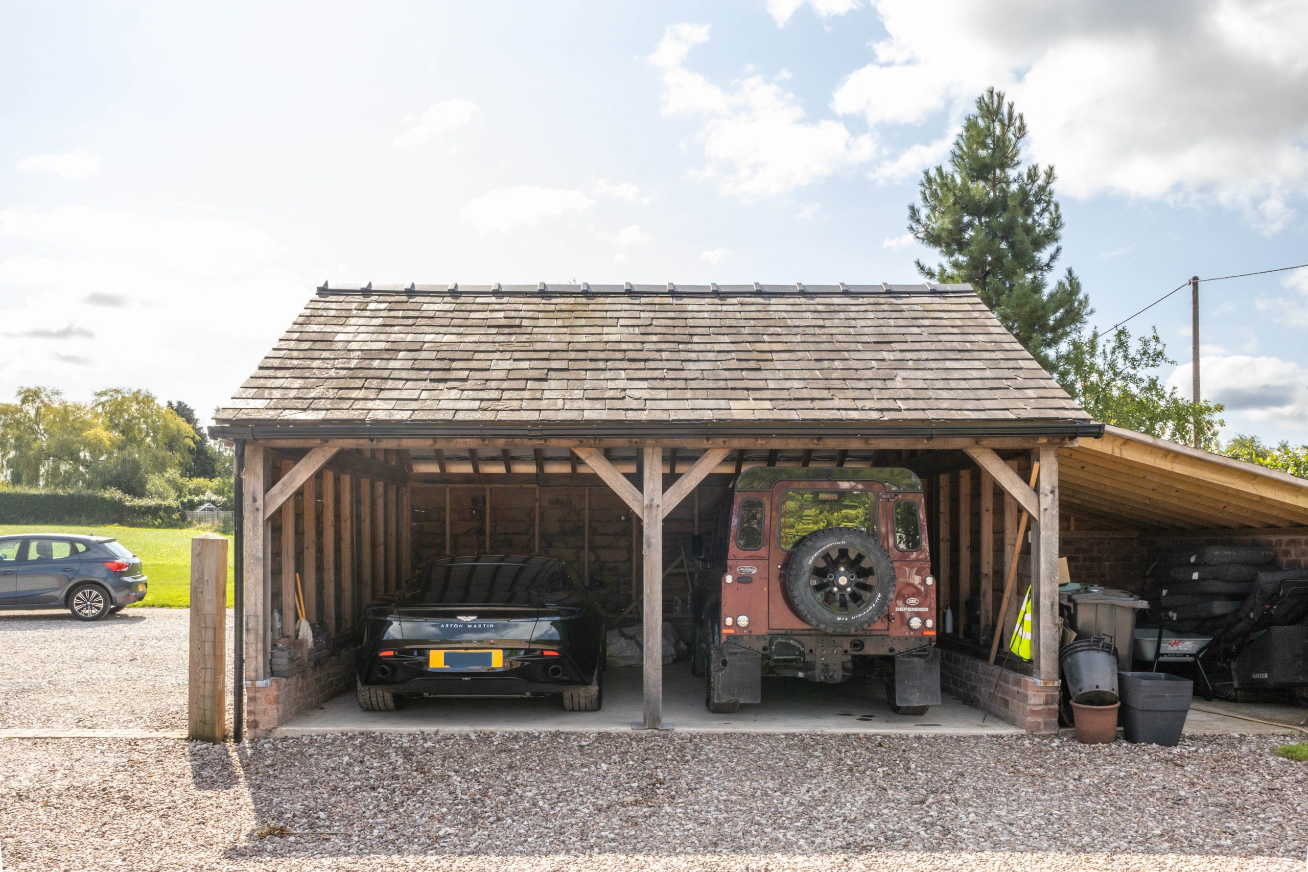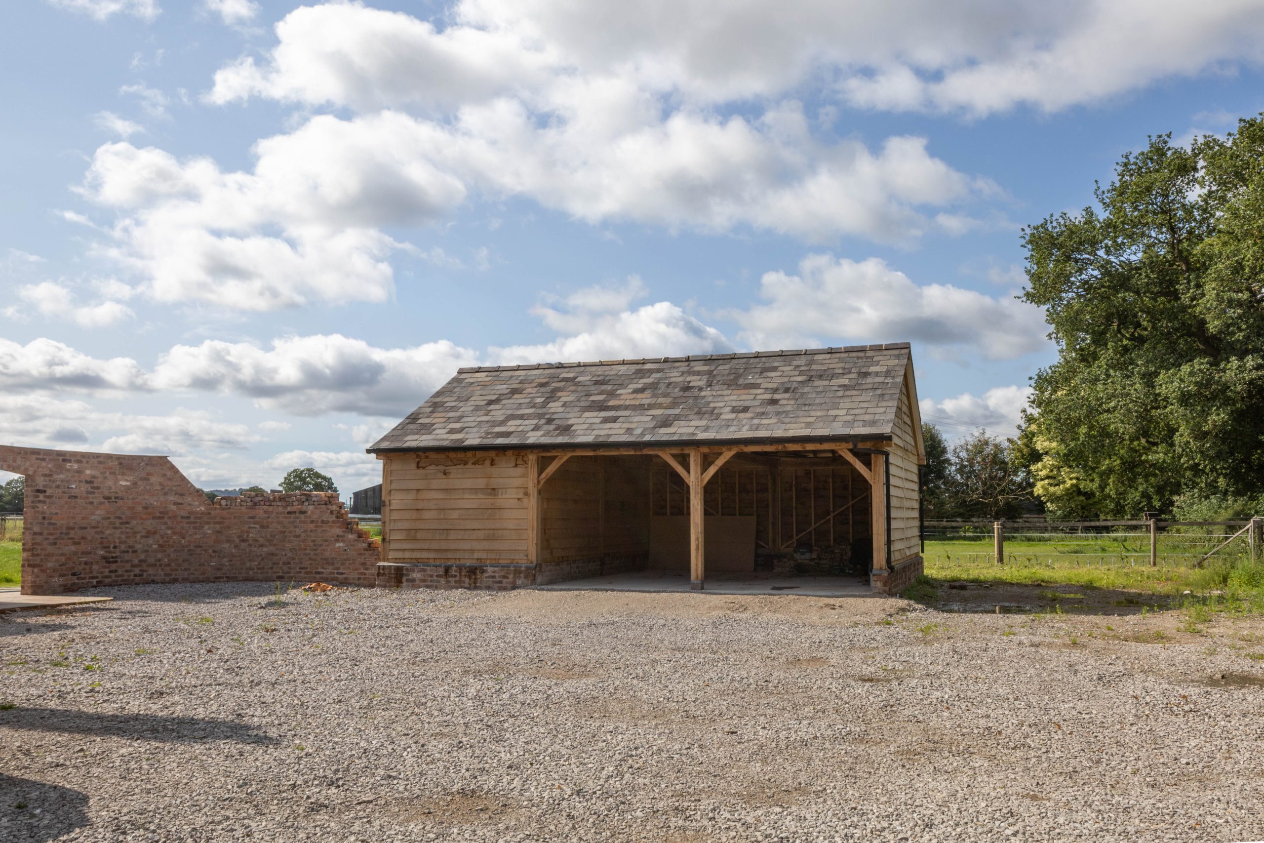 – Two 2-Bay Oak Garages: Each garage was built using traditional green oak posts and beams with open-fronted bays to maximise accessibility. Mortise-and-tenon joints, robust corner bracing and carefully selected timber ensured strength while delivering the rustic, timeless look the client desired.