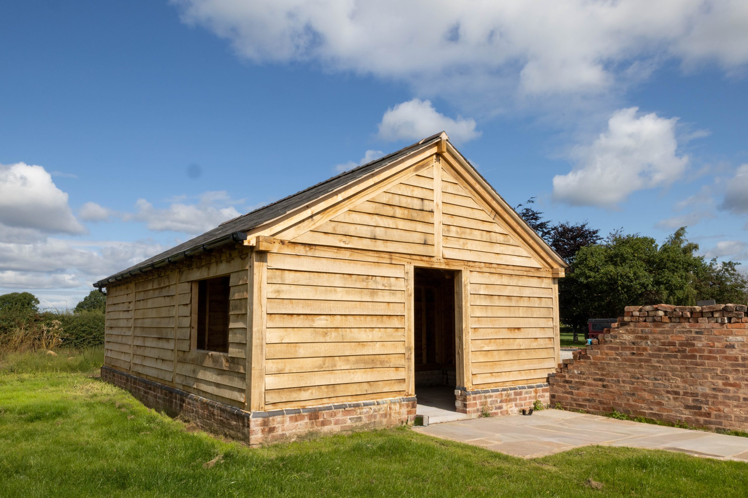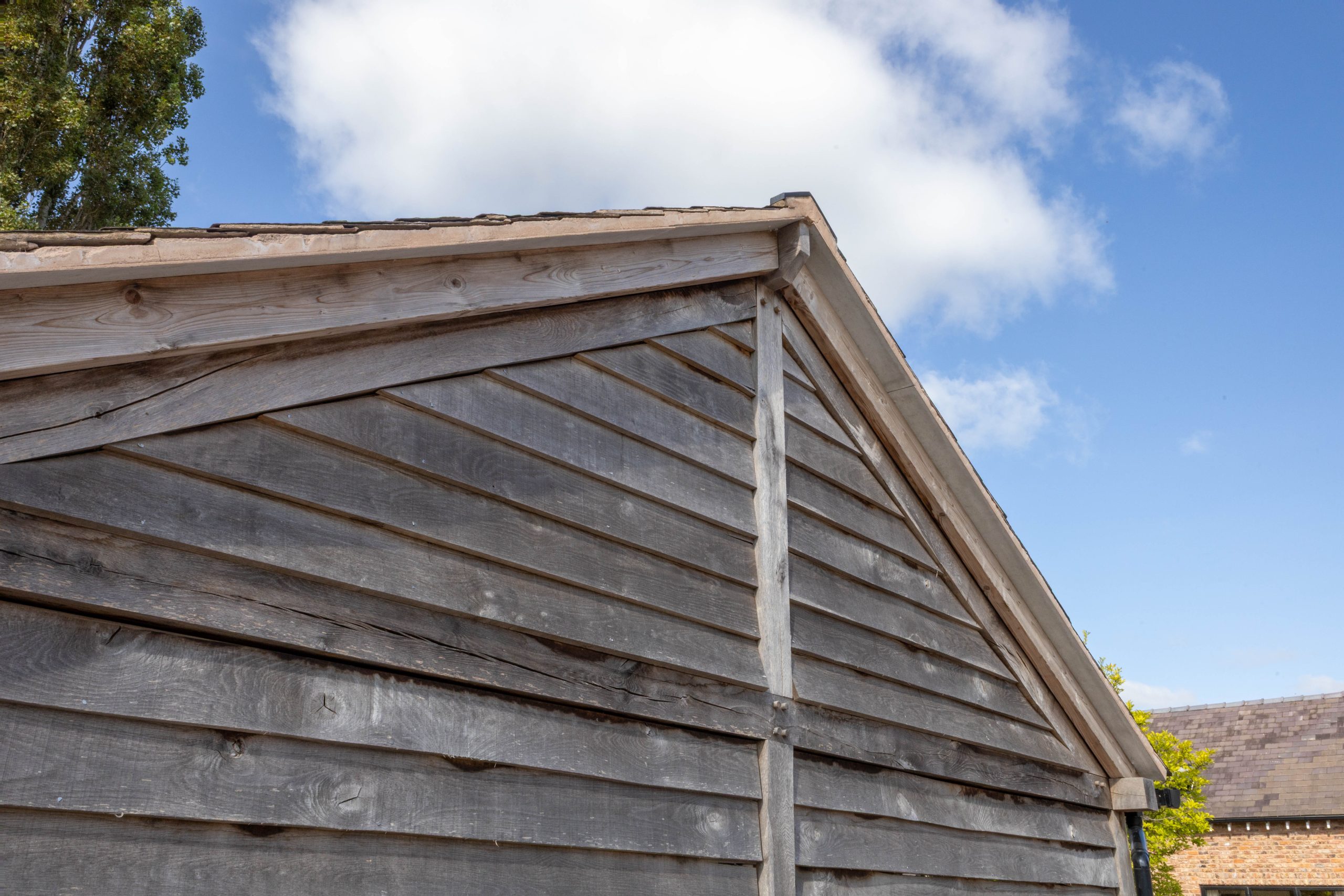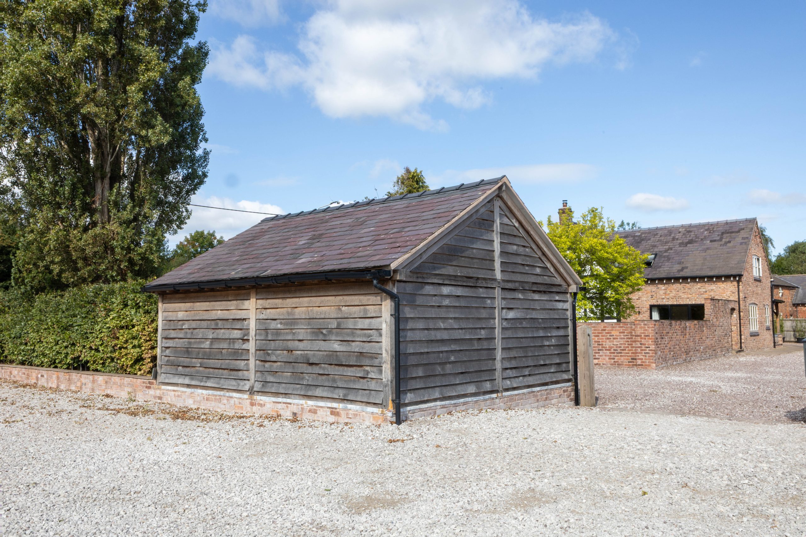 – Three-Bay Oak Garage with Enclosed Storage: For the larger garage, we incorporated an enclosed bay to provide secure storage for tools, equipment or bikes. The oak frame was complemented by timber cladding and brick plinth detailing to tie into surrounding buildings.