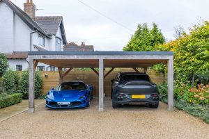A carport differs from a garage by only being semi covered, with at least 2 sides open. Often this will consist of just an Oak frame and covering roof, but construction methods and design will be similar to a garage.